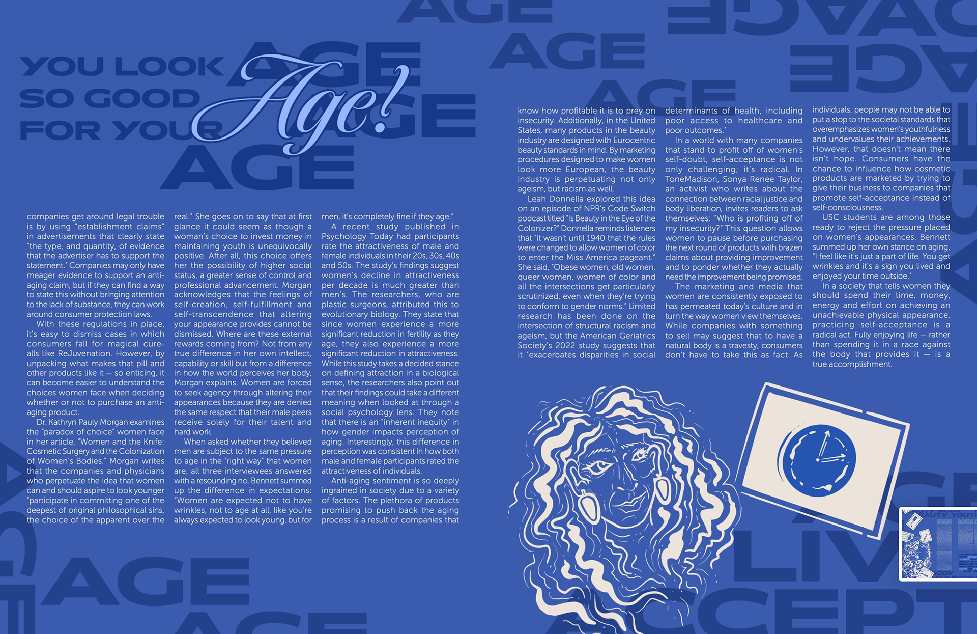 One set of print articles I especially enjoyed was the two connected articles below: "The Gift of Growing Older" and "Looking at Looking Good for Your Age." The former was a photoshoot, so I was able to work with arranging images through the spread in an engaging way. Because the latter was a more traditional article with no accompanying photos, I was able to create illustrations as well as interesting typographic effects for the visuals.